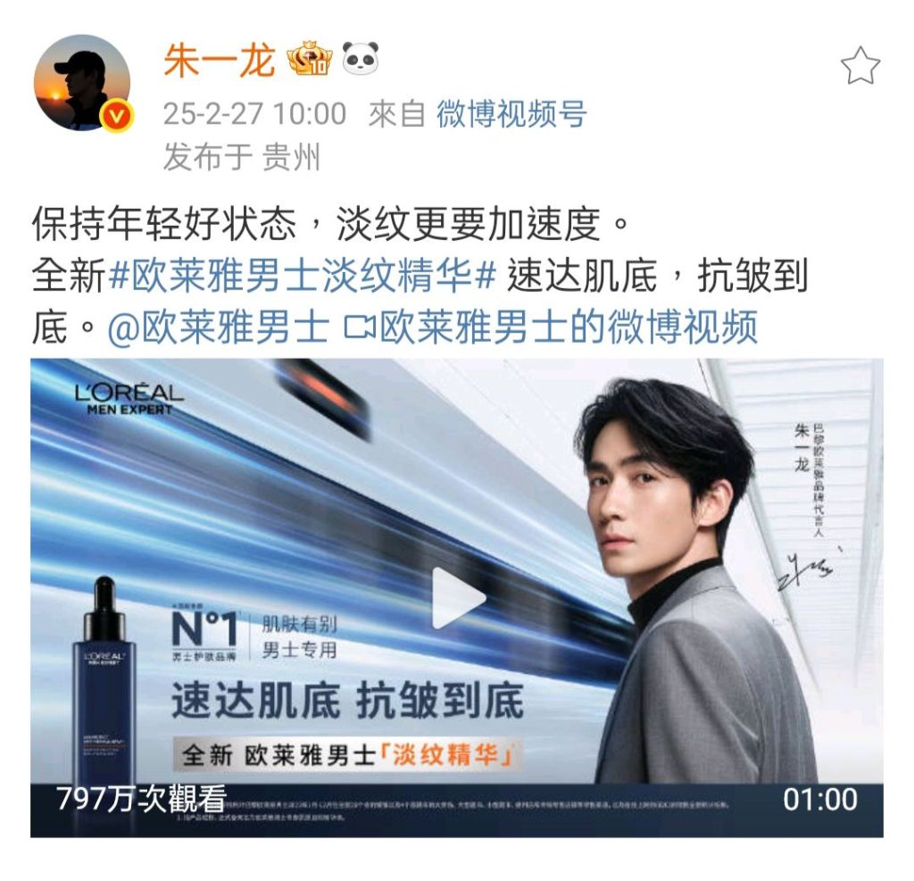2月27日朱一龍代言L’Oréal 男士淡紋精華