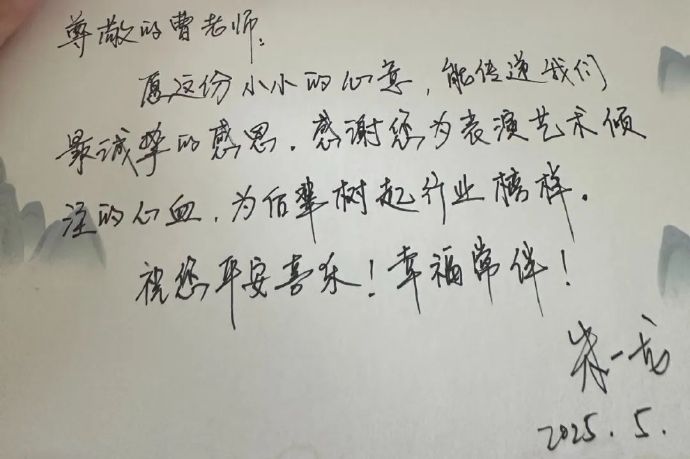 “願這份小小的心意,能傳遞我們最誠摯的感恩,感謝您為表演藝術傾注的心血,為後輩樹起行業榜樣,祝您平安喜樂!幸福常伴!"